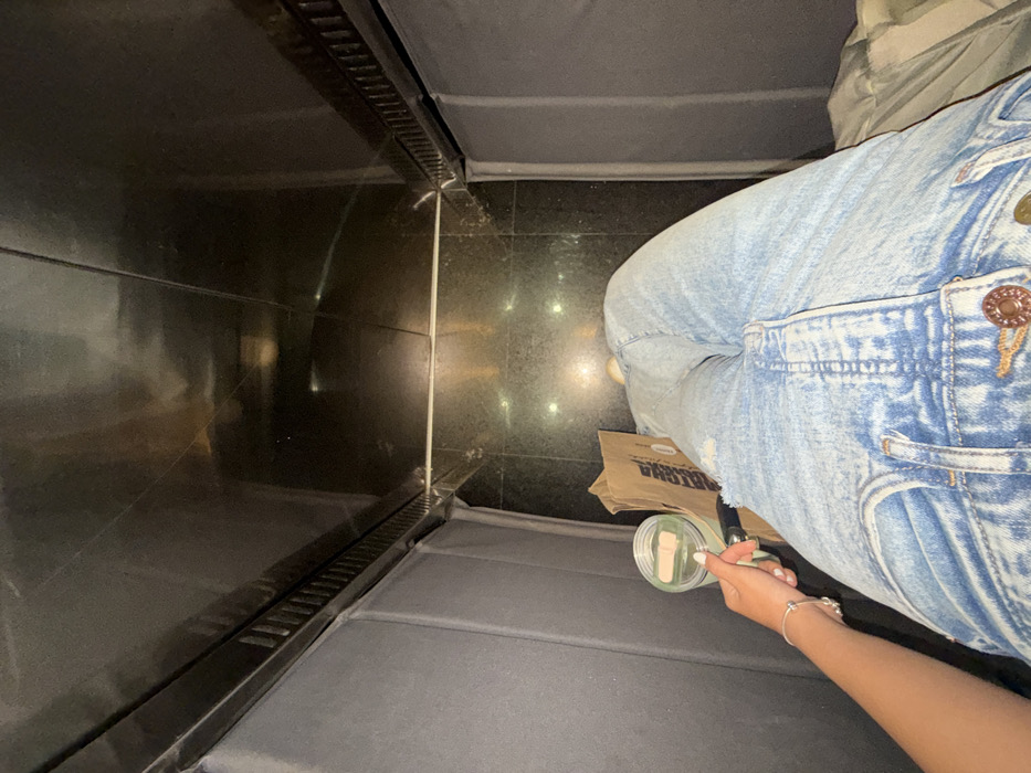 The scene depicts the interior of a confined, elongated space, potentially an elevator, small transport module, or cargo container, located in Santa Catarina, Mexico. The walls, ceiling, and floor are composed of dark, reflective materials, possibly polished metal or stone, with visible light reflections on the floor surface. Parallel metal tracks or rails are installed along the upper perimeter of the side walls. A person is depicted from a top-down perspective, seated or reclining within this space. The subject's lower torso and legs are covered in light-wash, distressed denim jeans with visible rips on the left thigh. The individual's left arm and hand are visible in the foreground. The hand, featuring white nail polish and a silver bracelet, holds a transparent plastic cup containing a light green substance. A dark, cylindrical object, possibly a straw or vaping device, is either inserted into the cup or held alongside it. To the left of the person's legs, a crumpled brown paper bag with partially legible text, including "DELICIA" and "PROTE...", rests on the floor. The person's feet, wearing light-colored footwear, are faintly visible at the far end of the space.