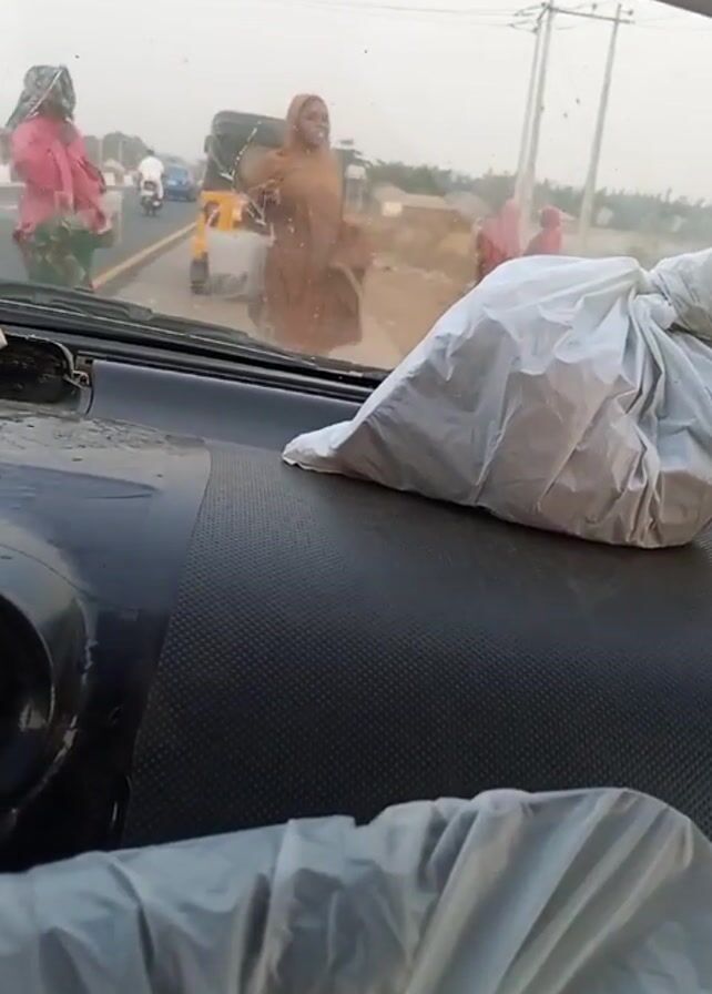 From the perspective of a car interior, the video shows a dusty roadside scene. Several people, mostly women, can be seen. Some wear hijabs or other modest clothing. A yellow auto rickshaw is visible in the background. In the foreground, on the car's dashboard, there are two white plastic bags. The background appears dusty or hazy.