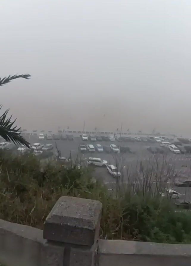 parking lot obscured by heavy fog. The view is from an elevated position, possibly a cliff or hill, looking down upon the parking lot. A wooden fence runs along the edge of the viewpoint. In the beginning, a palm frond is visible on the left. As the camera pans, several cars are seen scattered throughout the parking lot. Later, the camera focuses on the ground, showing feet in white sneakers and feet in sandals. The footage suggests a day with extremely low visibility due to fog.