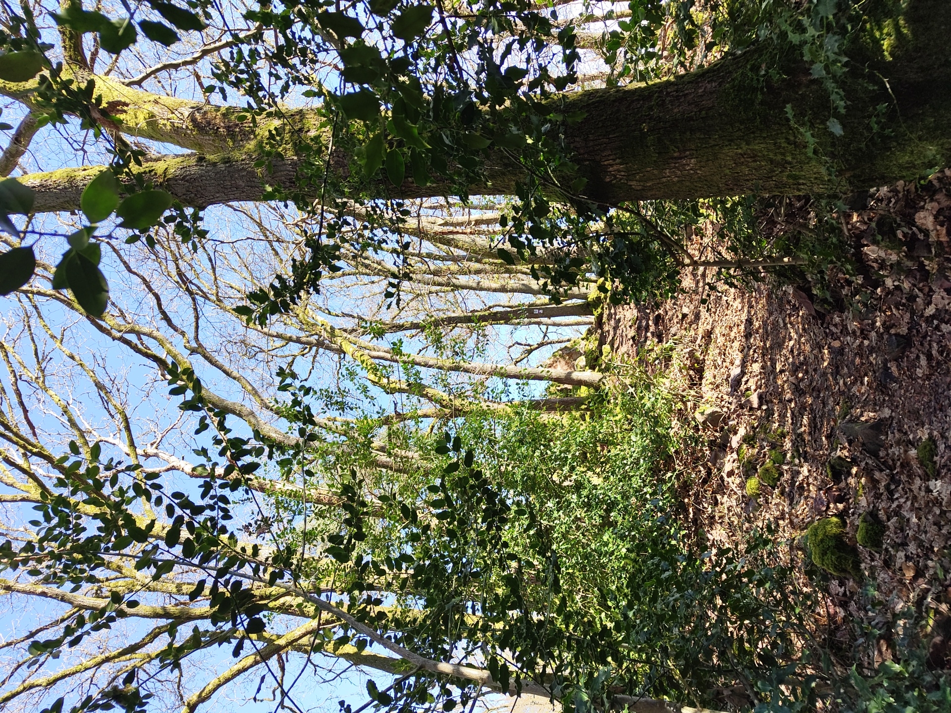 This image depicts an uphill wooded path located in Mettlach, Germany. The scene is dominated by numerous deciduous trees, many with their upper branches largely bare of leaves against a clear blue sky. Tree trunks and larger branches are extensively covered in green moss and lichen. Dense evergreen foliage, identifiable as holly, forms a thick undergrowth and is observed climbing several tree trunks, presenting dark green, glossy leaves. The ground is covered with a thick layer of dried, brown fallen leaves, with scattered moss-covered rocks and exposed roots visible along the ascending path. Bright sunlight illuminates the scene from an unseen source, creating distinct shadows on the ground and foliage. No individuals, animals, or man-made objects are present in the frame.