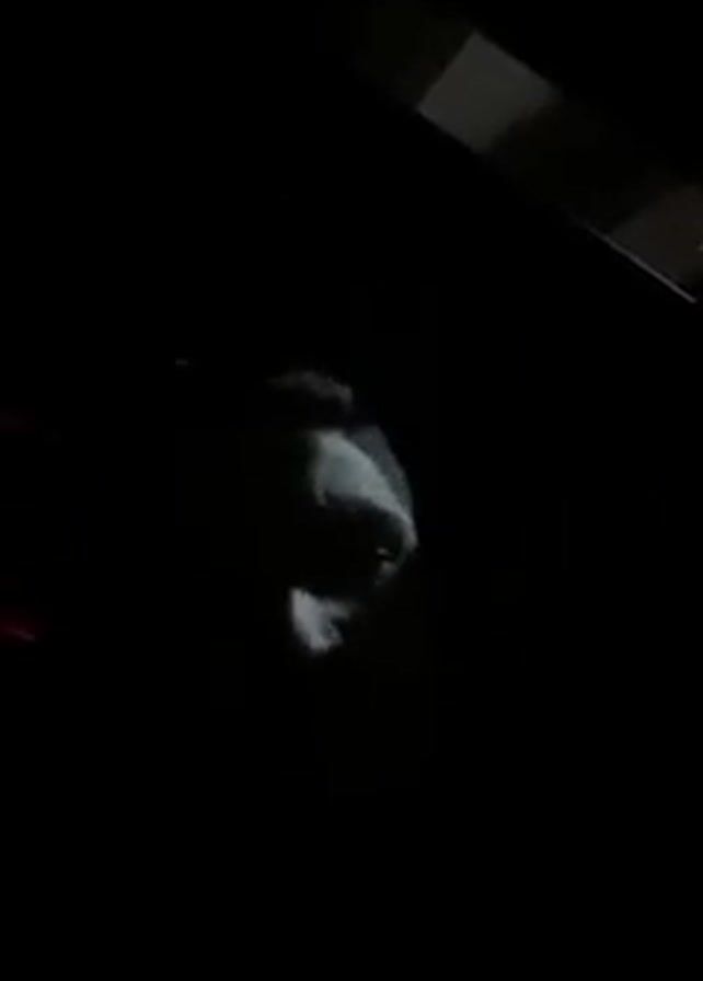 A video filmed inside a vehicle at night, suddenly lights up to reveal a man in a black puffer jacket, looking straight ahead.