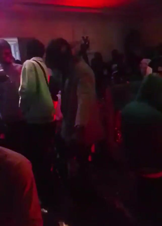 dimly lit room, possibly a club or party setting, with multiple individuals