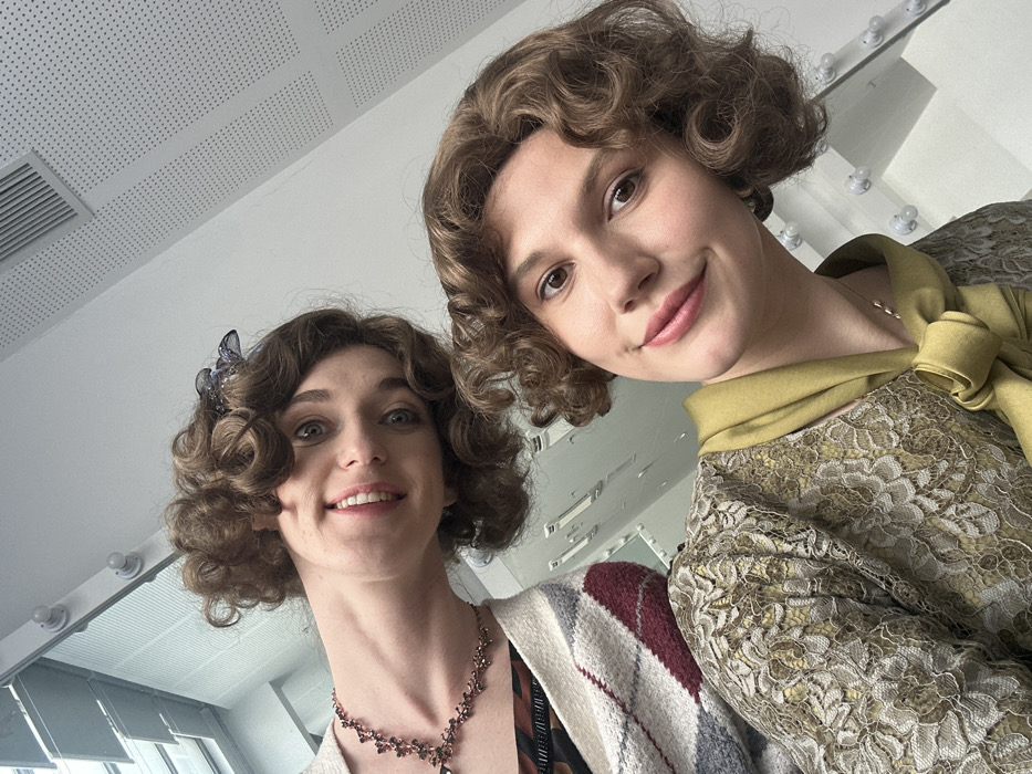 Two Caucasian females are depicted in a close-up, angled photograph within an indoor setting, identified as Huangdao District, China. The environment is consistent with a dressing room or backstage area. Both individuals have stylized, curly medium-brown hair and are smiling directly at the camera. The female positioned higher in the frame wears a cream cardigan with a white, maroon, and dark brown argyle pattern, and a red-brown ornate necklace. She exhibits light-colored eyes. The female positioned lower in the frame wears a golden-yellow garment with a lace overlay, featuring a golden-yellow bow-tied necktie or scarf. She exhibits dark-colored eyes. The background elements include a white ceiling with an air vent and linear recessed lighting, and a vertical series of exposed bulb vanity lights on the right, indicative of a makeup mirror station.