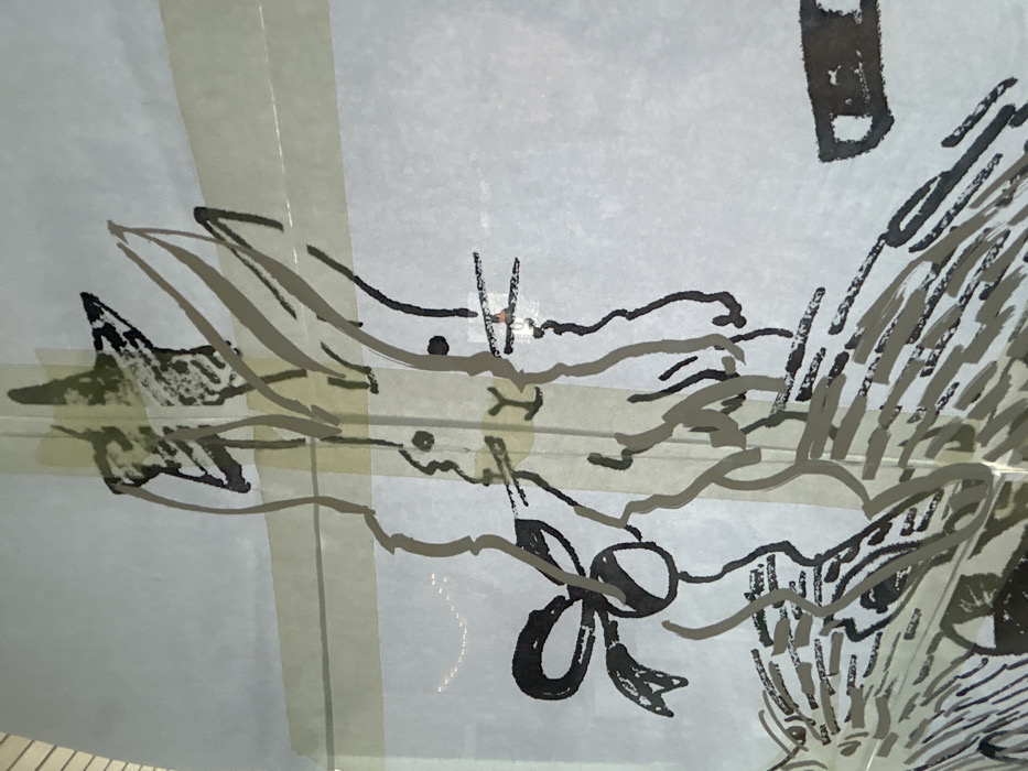 This image captures a close-up of a stylized ink drawing affixed to a surface, situated within the city of Como, Italy. The artwork features multiple rabbit-like figures rendered with black and dark grey lines on a light, possibly translucent, background. The central rabbit, lighter in tone, exhibits elongated ears and whiskers, with a prominent black star crowning its head. A black bow is drawn to the left of this rabbit, appearing to hold a dark circular object. A second, darker outlined rabbit is partially visible behind and to the right of the central figure. The lower portion of the image shows a textured area composed of horizontal black and dark grey strokes, suggesting a ground or basket. The drawing is secured by translucent adhesive tape, forming a cross pattern with a central vertical strip and two horizontal strips crossing it. Subtle reflections, including a small red light source, are visible through the artwork, indicating its placement against a reflective or transparent surface, likely a window.