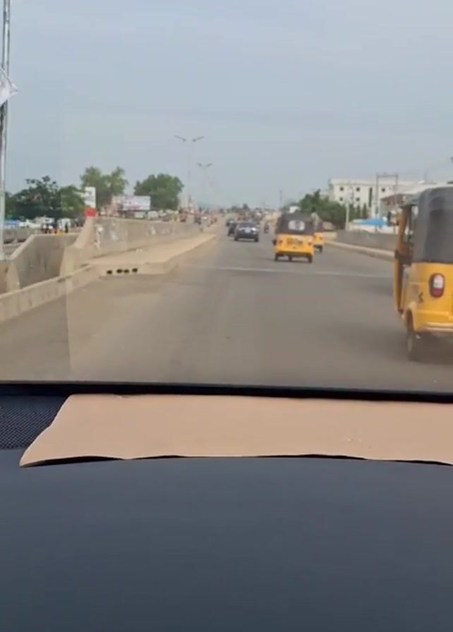 view from inside a car looking out onto a roadway with light traffic. The road appears to be a divided highway with a concrete barrier separating the lanes. Several yellow auto rickshaws, known as "keke" in Nigeria, are visible on the road. Other cars are also present. There are streetlights lining the road. In the distance, buildings and trees can be seen. The sky is overcast. The dashboard of the car is visible in the foreground, with a piece of cardboard lying on it.
