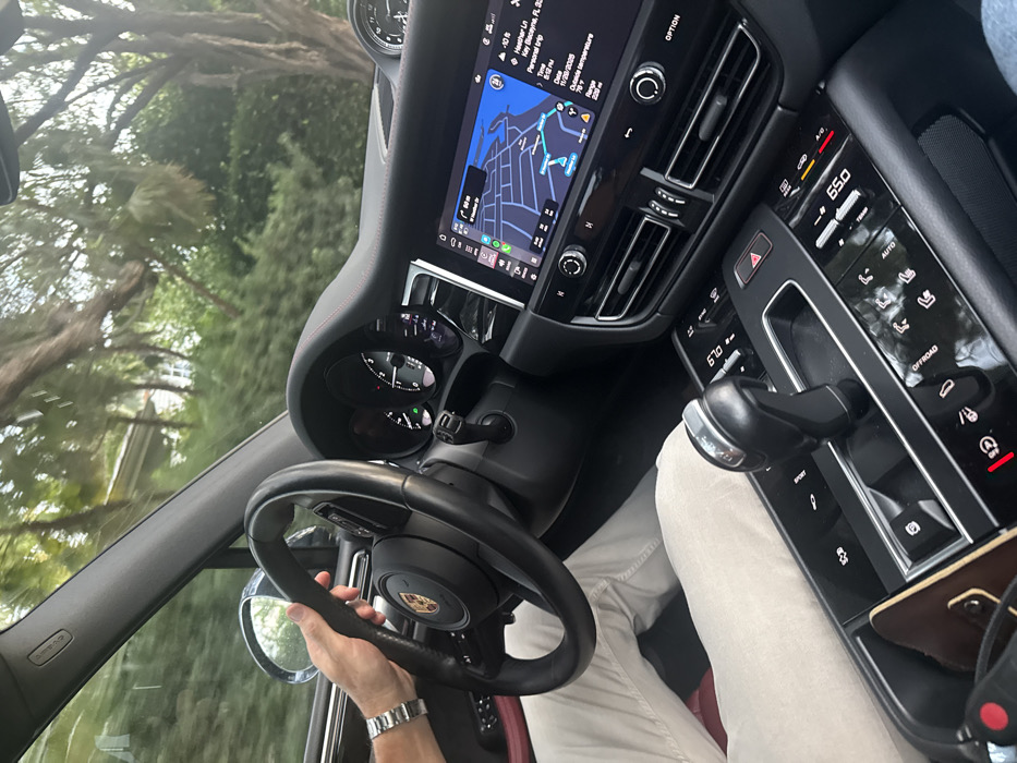 Inside a Porsche, the driver grips the steering wheel while navigating
