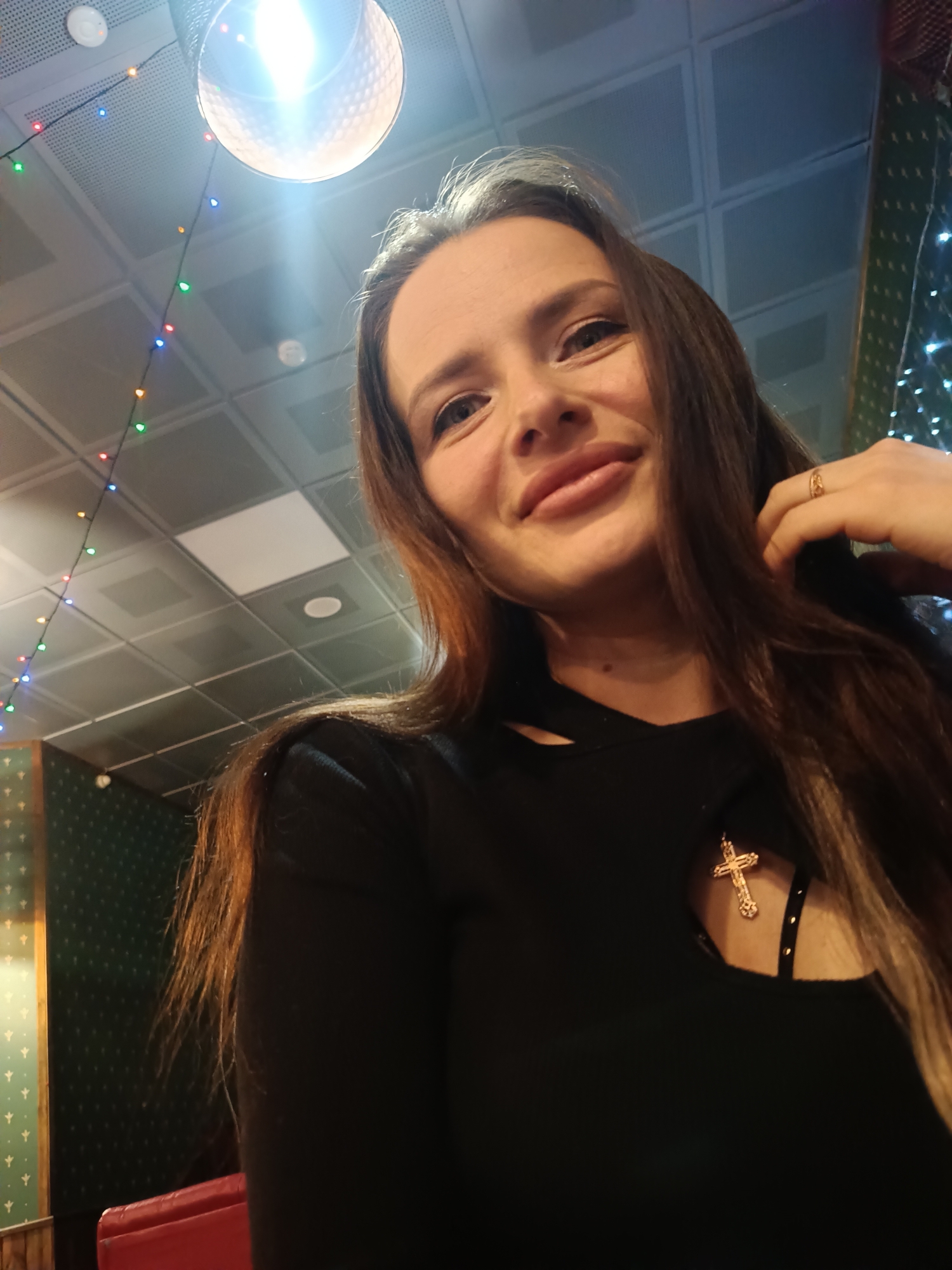 A woman with long brown hair, wearing a black top with a gold cross pendant and a gold ring, is taking a selfie. The background shows a decorated interior with string lights, suggesting a festive or holiday atmosphere. The location appears to be indoors. The city mentioned is Chaikovsky, Russia.