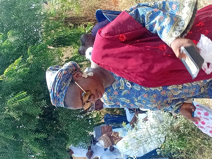A group of people are gathered outside, with one person in focus. This individual wears a blue patterned headwrap and a blue and gold patterned top, topped with a red robe. They are wearing sunglasses and appear to be holding a tray and a packaged item. Other people are visible in the background, some wearing white caps and traditional attire. Green foliage is also present in the scene.