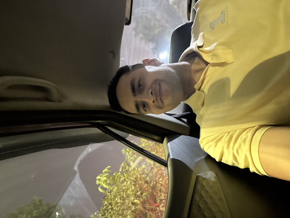 A male subject is depicted seated inside a vehicle at night. He possesses short, dark hair and a light complexion, exhibiting a faint smile directed towards the camera. The subject wears a yellow, short-sleeved polo shirt with a metallic '1' logo on the left chest and a small silver hoop earring in his left ear. The vehicle's interior features a light-colored ceiling, a visible car seat headrest, and a textured lower door panel. Through the vehicle's left-side window, illuminated foliage, displaying green and reddish-orange hues, is visible against a dark night sky. No specific landmarks or architectural details are present to precisely identify a location within Kolkata, India.