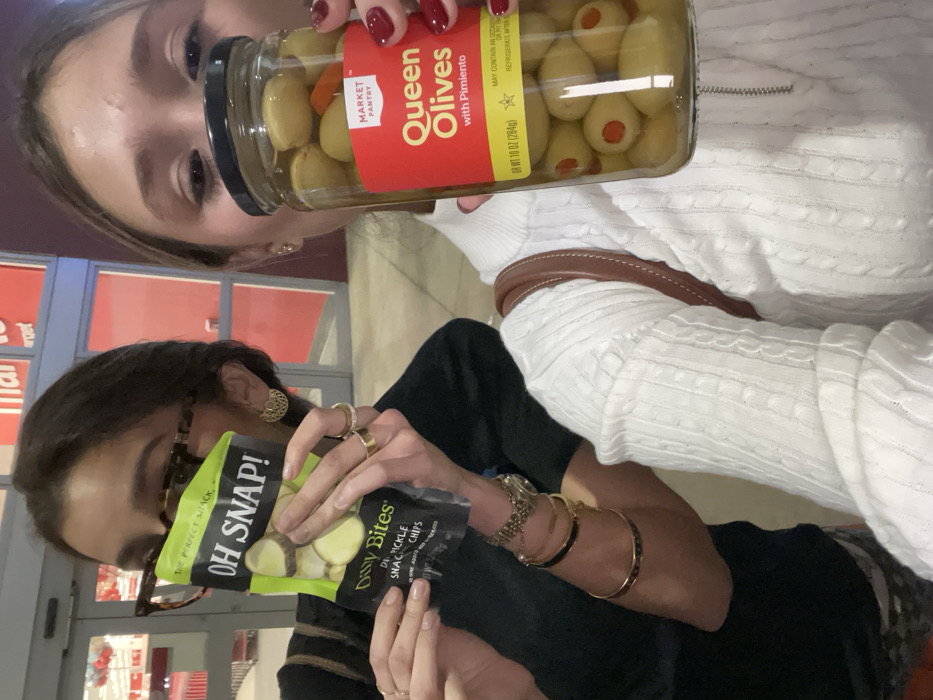 Two women pose with snacks. One holds a jar of Market Pantry Queen Olives with Pimiento, the label visible with the text and olive contents. The other holds a bag of "OH SNAP!" Dilly Bites Snack Pickle Chips, also showing the label. Both women are partially visible, with details like jewelry and clothing styles noticeable. The photo is taken indoors, potentially at a store.