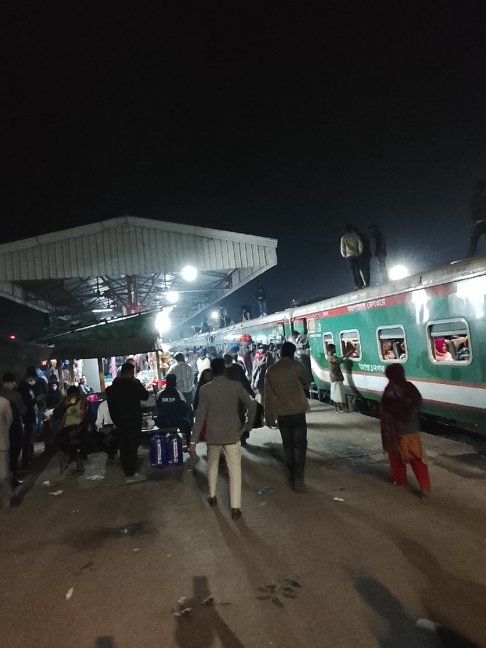 At a nighttime train station, a crowded platform teems with people. A green and white train car is visible, with individuals perched on its roof. The carriages bear Bengali script. Passengers fill the train's interior and look out of the windows. Under the station's lighted shelter, more people gather, some seated, and several walking towards the train. The scene suggests a bustling railway station.