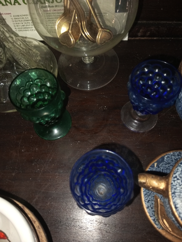 The image showcases a collection of glass objects on a dark surface. A large glass container filled with spoons with heart-shaped details is prominent. Beside it, a green glass cup with a textured surface sits. Two smaller blue glass cups, also with a textured pattern, are positioned nearby. Finally, a teacup with a blue and white pattern and a golden handle rests beside one of the blue cups. The composition is tightly cropped, focusing on the arrangement of these glassware pieces.