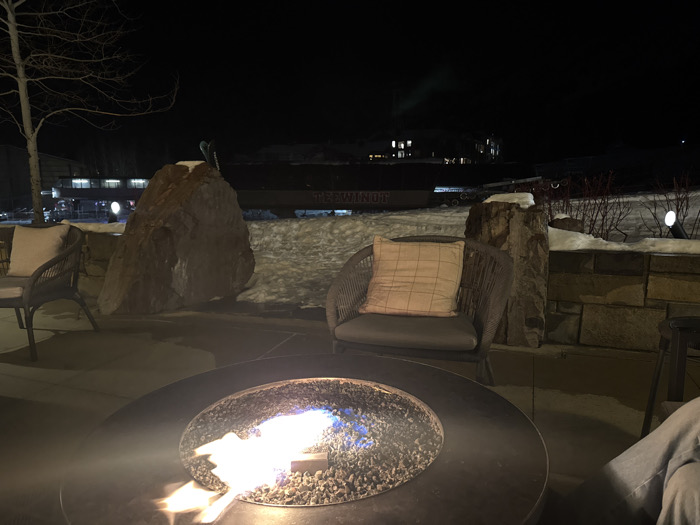 A nighttime view of a fire pit surrounded by chairs on a patio. Snow covers the ground beyond the patio, with buildings visible in the distance. Rocks and a low stone wall act as a barrier between the patio and the snowy area. The fire pit is circular and emits a warm glow. One chair has a light-colored pillow, and another has a patterned pillow. The sky is dark, suggesting a clear night.