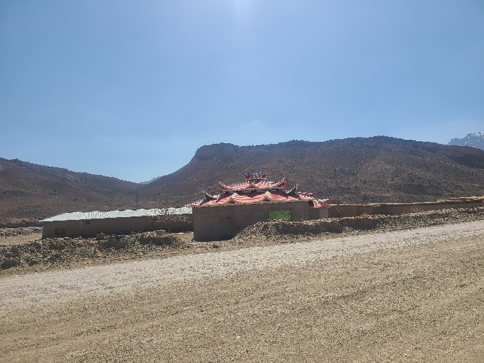 The image displays an arid, mountainous landscape in Kach, Pakistan, under a clear blue sky with bright sunlight. A wide, light-brown dirt road occupies the lower half of the frame. In the midground, a light-colored building with a distinctive, multi-tiered red roof featuring ornate upward-curving eaves and colorful finials in green, blue, and red hues is positioned right of center. A green rectangular panel, possibly a window or door, is visible on its facade. To its left, a longer, single-story structure with light-colored walls and a light-toned, possibly corrugated metal roof is present. A low, light-colored retaining wall runs horizontally between the road and these structures, fronted by irregular piles of light-colored material. The background consists of dark, barren mountains; faint snow-capped peaks are visible in the far distance on the right. No individuals, animals, or vehicles are present in the scene.