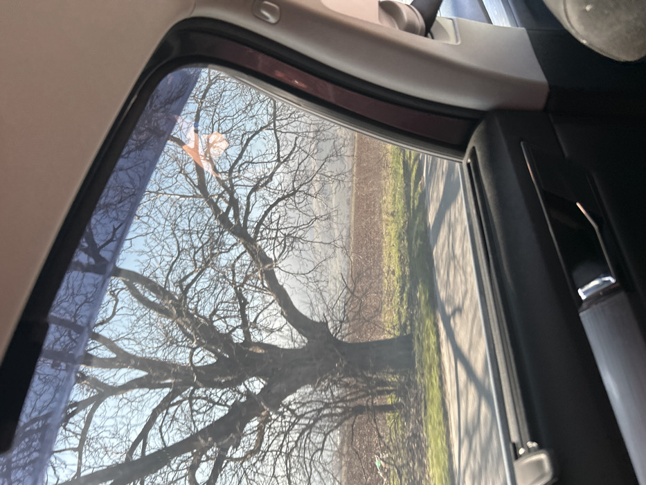 The image depicts an exterior rural landscape viewed from within a vehicle, specifically through a side passenger window, in the city of Vetren Dol, Bulgaria. The sky is clear blue. A prominent, large deciduous tree with a thick trunk and numerous bare, intertwining branches dominates the left and central upper portion of the exterior scene. An orange, translucent plastic bag is caught within the upper branches of this tree. To the right of the tree, tilled brown agricultural fields are visible, extending towards hazy, distant hills or mountains under the clear sky. A paved road or path with visible long shadows, indicating a low sun angle, runs horizontally across the lower middle of the frame, flanked by a strip of green grass and foliage. The interior of the vehicle shows a dark window frame with a blue tinted upper portion and a dark plastic window deflector. The vehicle's door panel, dark in color, is visible in the lower right, featuring a chrome-finished door handle. No individuals are present or discernable in the scene.