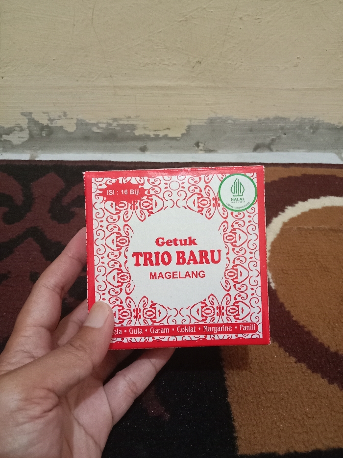 An indoor scene in Brangsong, Indonesia, captures a human hand holding a rectangular box of "Getuk Trio Baru Magelang