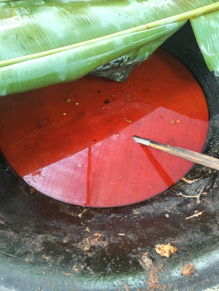 A close-up, top-down perspective captures the interior of a large, dark, circular cooking vessel located in Jambo Dalam, Indonesia. The vessel holds a viscous, reddish-orange liquid, likely a culinary preparation. Partially submerged within this liquid is a flat, circular red object. A fresh, green banana leaf, appearing wet, extends over a portion of the liquid and the red object from the upper left. A wooden utensil with a metallic tip is positioned within the liquid, resting against the red circular object, entering from the upper right. Small, light-colored particles are visible floating on the surface of the reddish liquid. The inner dark walls of the vessel, not submerged, display scattered residue, including yellowish, chunky material and fibrous strands.