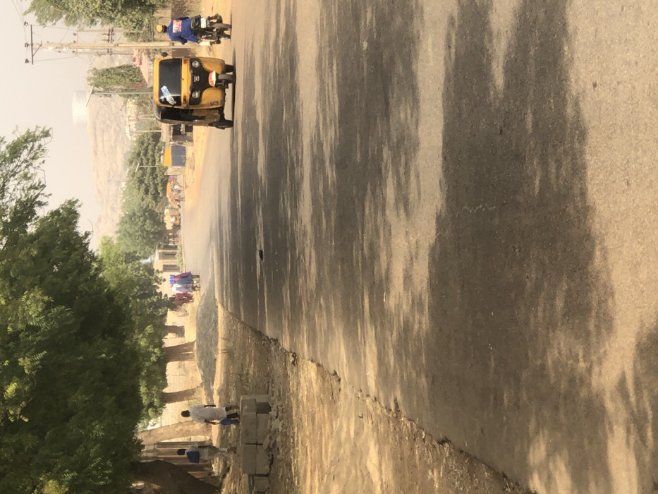 A sunny, slightly hazy street scene includes a yellow auto-rickshaw moving away from the viewer, followed by a motorcycle. Buildings and a rock outcrop are visible in the distance. The road occupies most of the frame, with long, tree-shaped shadows cast across the pavement. Trees line the left side of the street, with people and construction materials near the sidewalk. The image is rotated clockwise, making the street appear vertical.