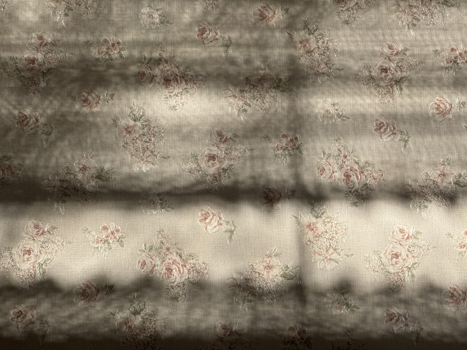 This image depicts a floral patterned fabric, likely a curtain or wallpaper, illuminated by natural light in an interior setting within the city of Zelenogradskiy, Russia. The fabric background is a light beige or cream color, patterned with clusters of pink and rose-colored roses, light green leaves, and smaller, intricate floral elements. The entire surface is crisscrossed by distinct, irregular shadows, indicative of sunlight filtering through an external obstruction such as window mullions or foliage. No individuals, direct actions, or other significant objects are visible within the frame. The interaction involves direct sunlight casting sharp shadows onto the patterned textile surface.