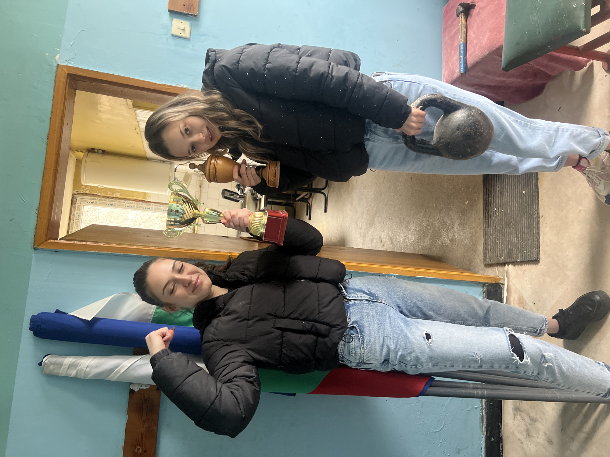 Two young females are depicted indoors, posing in a room located in Cherven Bryag, Bulgaria. The female on the left, with dark hair, wears a black puffer jacket, ripped light-blue jeans, and black sneakers. She flexes her left bicep and holds a gold-colored trophy with a red base in her right hand. Behind her, a Bulgarian national flag (white, green, red) is displayed on a pole, flanked by two rolled-up banners (one white, one blue) mounted on a light blue painted wall. The female on the right, with shoulder-length light brown hair, wears a black puffer jacket with small white flecks, light-blue jeans, and light-colored sneakers with pink and blue accents. She holds a light brown, turned wooden cup in her left hand and a dark grey cast iron kettlebell in her right hand. The room features light blue painted walls with some chipping. A wooden doorframe in the center leads to an adjacent room with yellow-cream colored walls, a visible white cylindrical water heater, and a window with white frames. The floor is a light-colored material, possibly concrete or tile, with a dark floor mat near the doorway. To the far right, a table draped in red fabric holds a hammer with a blue-painted wooden handle and a black head, alongside another metal tool. A green-cushioned stool is partially visible in the bottom right foreground.