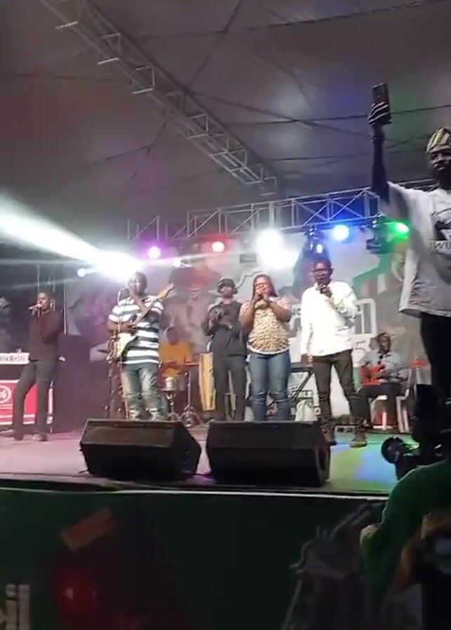 A live band is performing on an outdoor stage, with at least six members visible. The band consists of singers and instrumentalists, with one playing the guitar and another playing percussion instruments. The stage is equipped with speakers, lighting, and a backdrop. In front of the stage, a person is holding up a smartphone, seemingly recording the performance. Other people are in the foreground, possibly members of the audience. The event appears to be sponsored, as indicated by the banner at the front of the stage.
