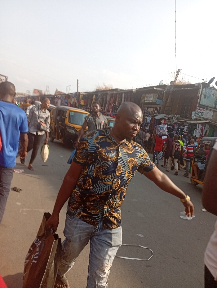 A man strides through a bustling outdoor market, clutching a large shopping bag. He wears a patterned shirt and ripped jeans, adorned with a gold bracelet. The crowded street is lined with vendors selling clothing and other goods. Yellow "keke napep" (three wheeled motorcycle taxis) navigate the scene. The sky is bright and hazy, suggesting a warm day.
