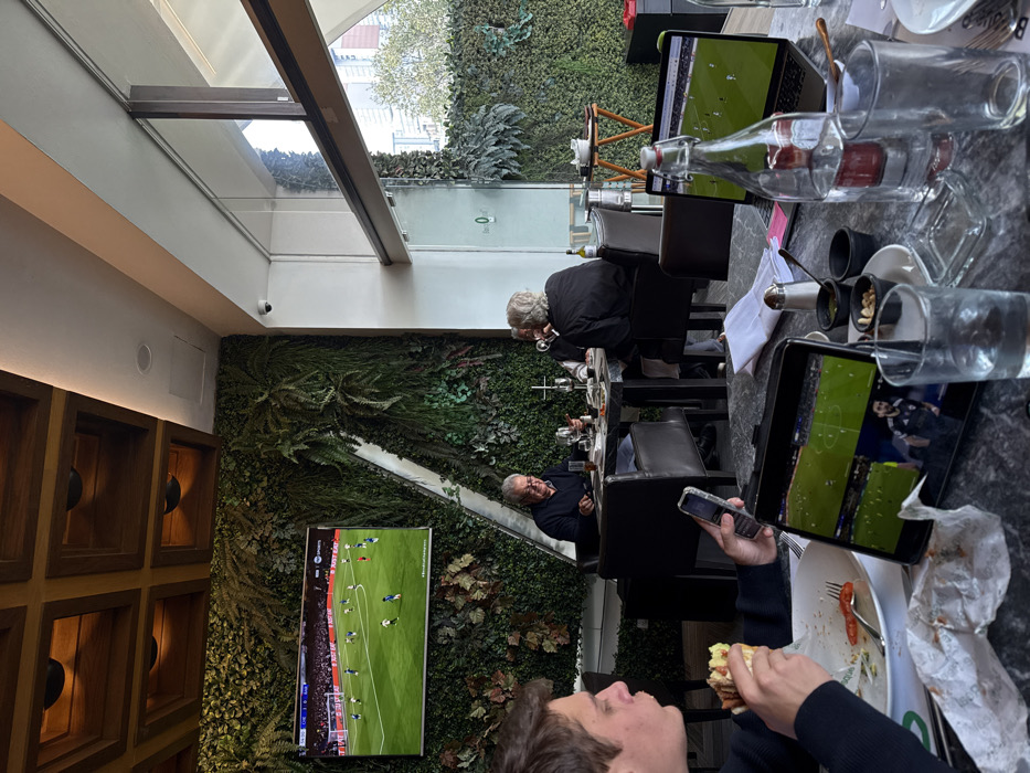 People watch a football game on different screens, including a large TV on a plant-covered wall and smaller devices like laptops and tablets, at a restaurant. The viewers are seated at tables with food and drinks. Some are eating and using their phones while enjoying the match. The restaurant has an indoor-outdoor feel with a glass ceiling section.