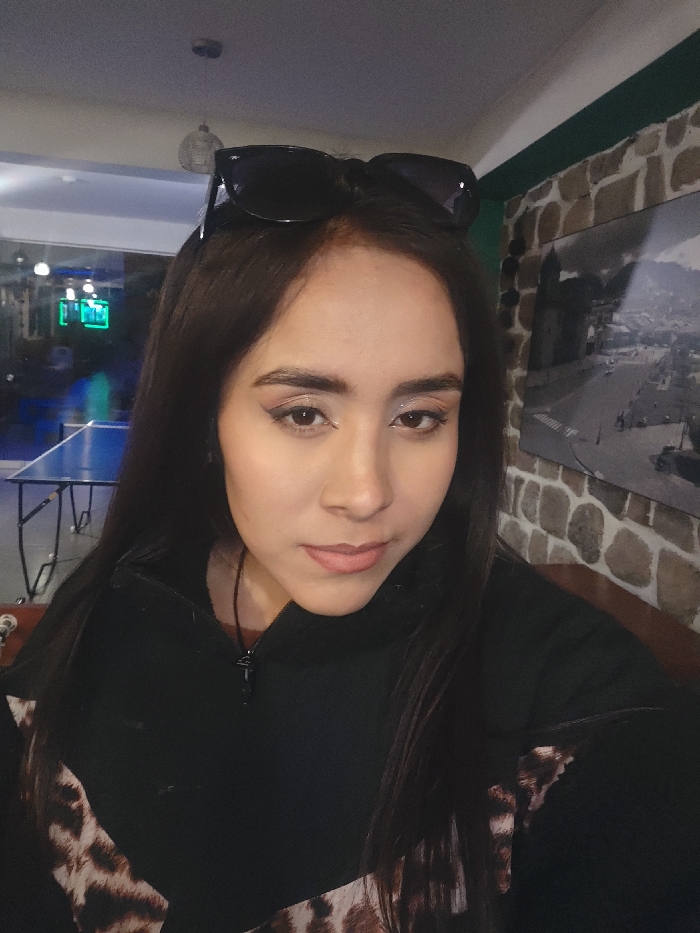 A young adult female is depicted in a close-up, head-and-shoulders portrait, looking directly at the camera with a neutral expression. She has long, dark brown hair, parted in the middle, with black sunglasses resting on top of her head. Her makeup includes light-colored eyeshadow with glitter on the eyelids, eyeliner, and light pink lipstick. She wears a black quarter-zip top with a prominent diagonal leopard print pattern across the chest and shoulders. A dark pendant hangs from a string around her neck, visible below the zipper. The background to the left is out of focus, revealing a dimly lit interior space with a blue-topped ping-pong table and what appears to be neon green lighting reflections. The background to the right features a wall with an irregular stone or brick texture, above which a large, framed black and white photograph is displayed. This photograph depicts an aerial or panoramic view of a city, showing winding roads and various buildings, identifiable as a scene from Cuzco, Peru. The wall above the stone texture is painted green.
