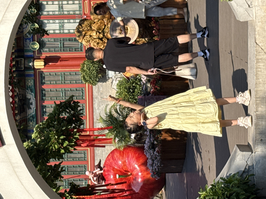 A young girl in a yellow dress points upward within a circular architectural frame. Behind her is a large red apple sculpture, greenery, and a man in a black shirt and shorts carrying a white bag. In the background, red-framed windows of a building are visible, along with other people and decorative elements. The scene appears to be outdoors, bathed in sunlight.