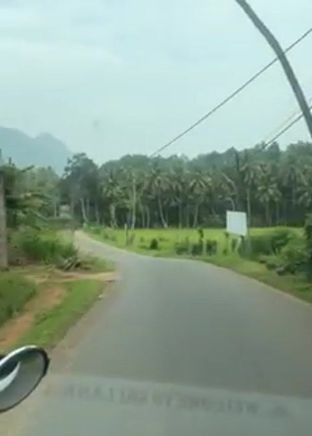 car driving on a narrow road through a rural area. Palm trees line both sides of the road, and there is a rice paddy in the background. A mountain is visible in the distance. The sky is overcast. The car appears to be in Sri Lanka.