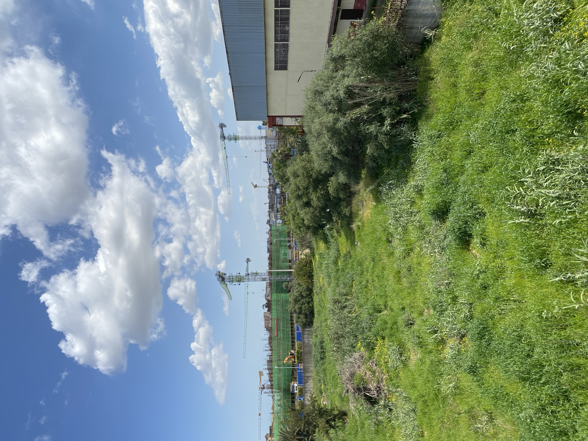 The image captures an outdoor scene in Baraki, Algeria, under a clear blue sky dotted with scattered white cumulus clouds. The foreground is dominated by a dense, unkempt expanse of green grass and weeds, interspersed with small yellow wildflowers. A pile of brown, dry brush is visible on the far left. In the midground, a line of various green bushes and small trees forms a natural barrier, beyond which a blue retaining wall or fence is present. Behind this barrier, a large construction site is visible, featuring multiple buildings in various stages of construction, largely enveloped in green safety netting. At least five tower cranes are operational or positioned within this site; two prominent green-and-white cranes stand towards the center-left, with others less distinct in the background. A yellow excavator and a white truck are identifiable within the construction area. To the right, a two-story industrial-style building with a light beige facade and a light blue corrugated metal roof is prominent. It features a row of rectangular windows along its upper section and a dark door or entrance on the lower right. A single exterior light fixture is mounted on its wall. Distant urban structures and additional trees are visible beyond the immediate construction zone. No people, explicit actions, or direct interactions are observable in the frame.