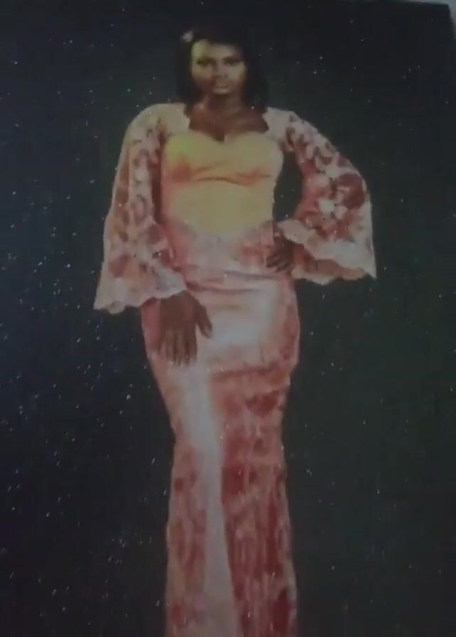 A close-up video shows a painting of a Black woman wearing a pink and white dress with lace sleeves. The background is black with white speckles. The woman is posing with one hand on her hip.