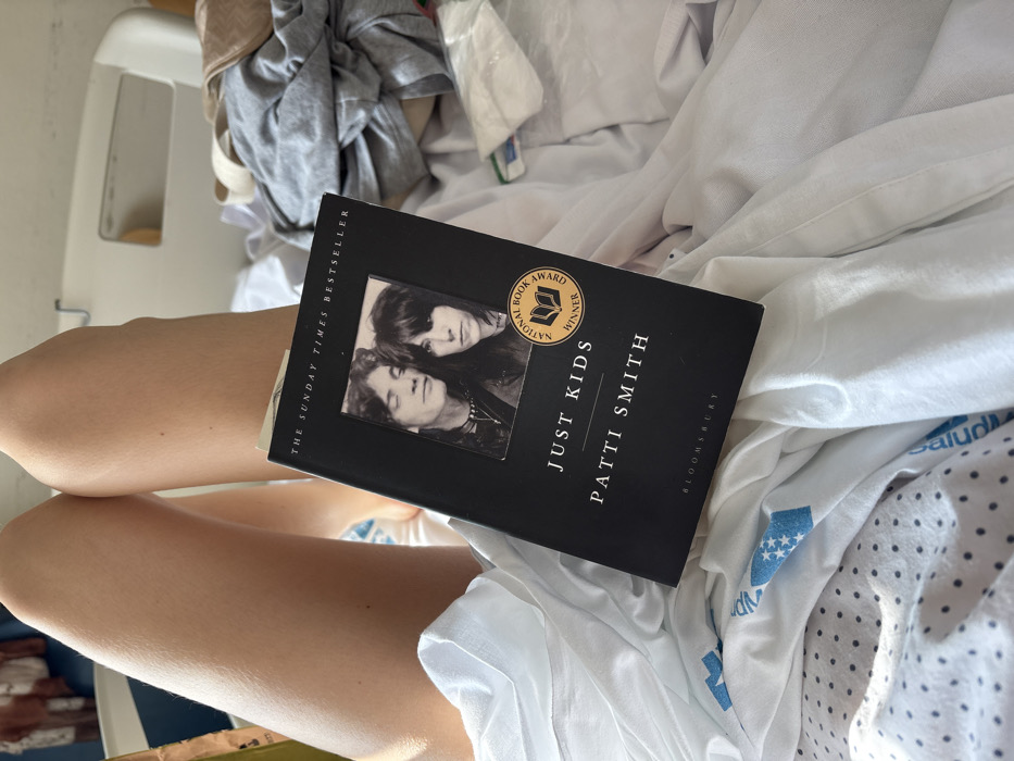 The image depicts a close-up view of a person's bare legs, resting in a hospital bed. A black hardcover or paperback copy of Patti Smith's book, "Just Kids," featuring a black and white photographic cover of Patti Smith and Robert Mapplethorpe, rests on the person's upper thighs. The book's front cover also displays "THE SUNDAY TIMES BESTSELLER" and a "NATIONAL BOOK AWARD WINNER" seal, along with the publisher "BLOOMSBURY." The bedding consists of crumpled white sheets, one of which features a repeating blue pattern that includes the text "Comunidad de Madrid" and "Hospital Universitario" alongside a star logo, definitively placing the scene within a public hospital in the city of Madrid, Spain. Beneath the white sheets, a grey sheet with small black polka dots is visible. To the right of the person's legs, a pile of miscellaneous clothing, primarily grey and beige, is present, partially obscuring a white, plastic or metal hospital bed rail or frame component. The scene is brightly lit, suggesting natural daylight.