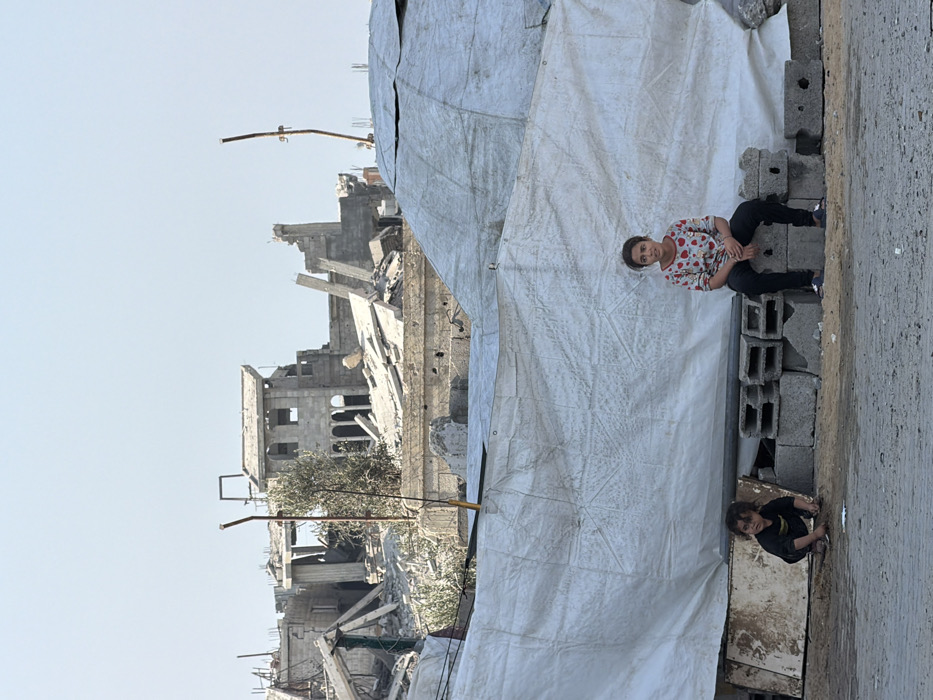 Two children are juxtaposed against a backdrop of devastation. One child sits atop stacked concrete blocks, gazing directly at the viewer. The other crouches lower, engaged in an unseen activity. Both are positioned against a white tarp-like structure. Behind this makeshift shelter, a scene of destruction unfolds. Buildings are reduced to rubble, with skeletal remains of walls and structures dominating the horizon. A solitary tree persists amidst the chaos.