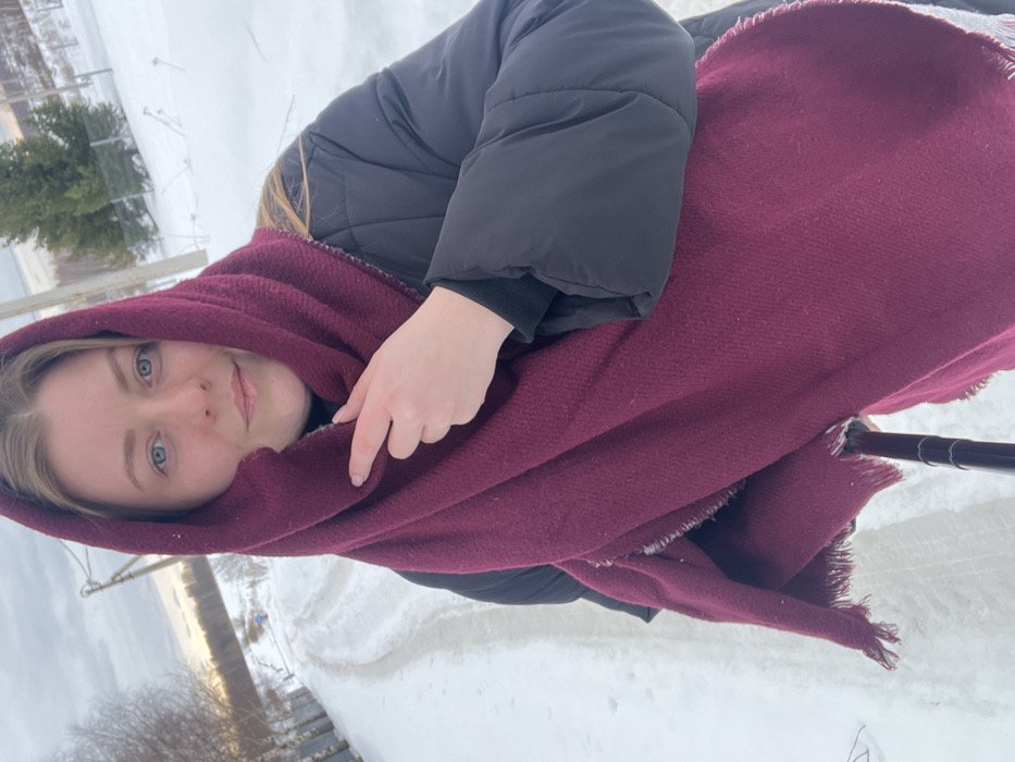 A young adult female is photographed outdoors in a snowy environment in Kalinino, Russia. She wears a black puffer jacket and a large maroon woven scarf draped over her head and shoulders. Her blonde hair is partially visible beneath the scarf, and she has blue eyes. Her right hand is positioned at her chest, touching the scarf. A black telescopic device, consistent with a selfie stick or monopod, extends downwards from her left side, partially obscured by the scarf. She is looking directly at the camera with a slight smile. The background consists of a snow-covered unpaved road with visible tire tracks, bare deciduous trees, a wooden fence, a utility pole, and an evergreen tree. The sky is overcast.