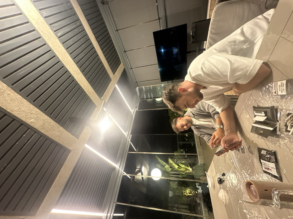 Two young men are seated at a table, one with a phone in his hand. Assorted items, including packets of cigarettes, are scattered across the table. A television is in the background, in front of a window overlooking a cityscape at night. The setting is a covered patio, with a modern ceiling featuring strip lighting. The overall ambiance suggests a casual, relaxed gathering.