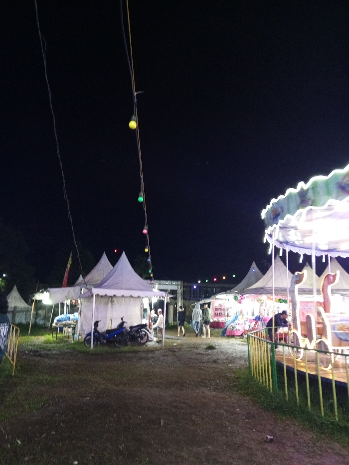 A night scene depicts a fair or festival with multiple white tents set up on grassy ground. Two motorcycles are parked under one of the tents. People are walking between the tents. Colorful string lights are strung overhead. To the right, a carousel with a green and yellow fence is visible. The overall lighting is dim, creating a nighttime atmosphere.