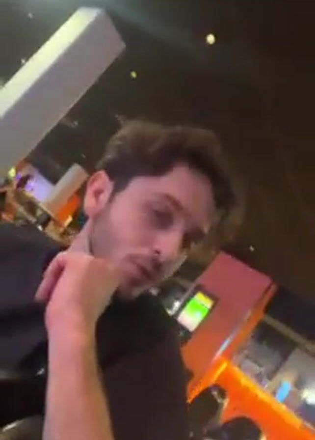 Two men are in a bowling alley. The man in the black shirt looks at the camera, showing the tops of the lanes in the background, and then smiles. The other man is wearing a white shirt and looks at the camera with a surprised look on his face.