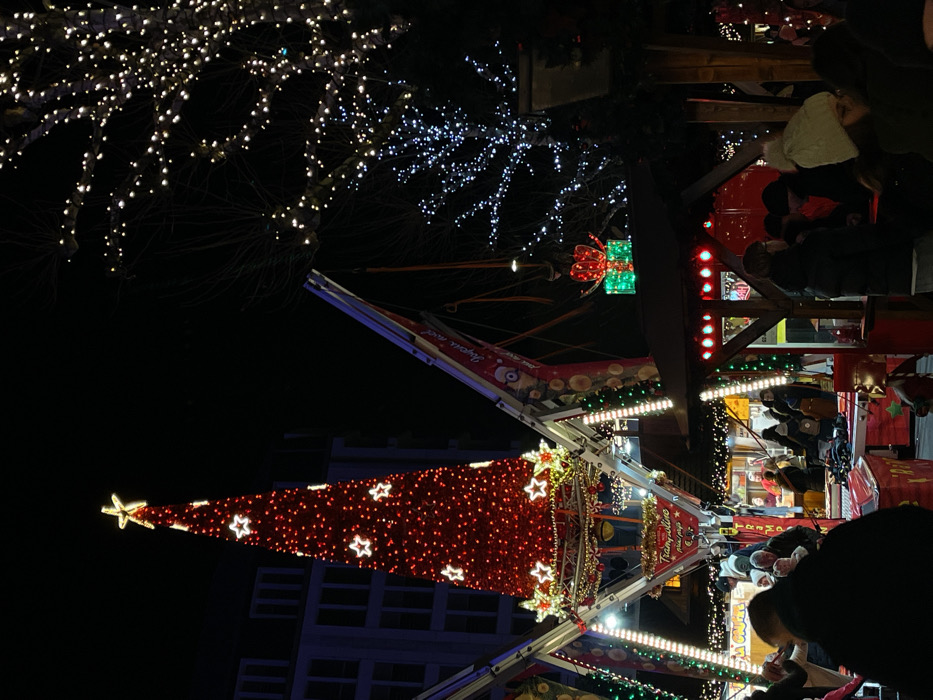 A nighttime image captures a Christmas market scene. A tall, red Christmas tree adorned with stars stands near a building. A trampoline ride is decorated with seasonal banners and lights. Bare trees strung with white lights are visible in the background. People are gathered at a stall or shop, suggesting activity within the market.