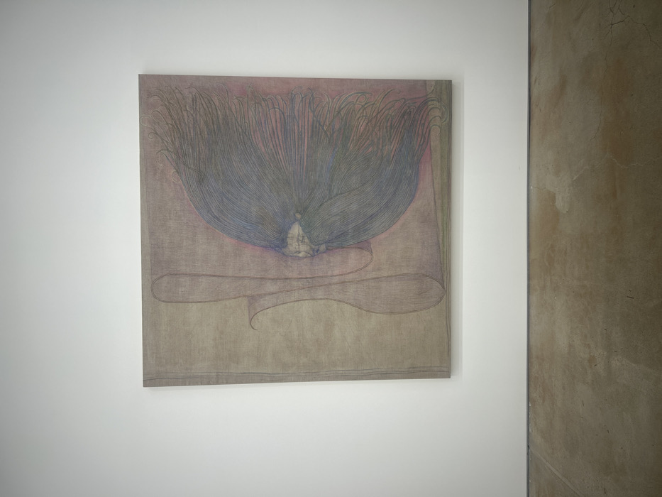 A square artwork with subtle color variations hangs on a white wall. The artwork depicts a central figure with long, cascading hair that dominates the top portion of the frame, rendered in muted blues and greens. A small face is visible beneath the hair. Two curvilinear shapes extend horizontally across the lower half. The background of the artwork features a gradient from pink at the top to a neutral beige at the bottom. A textured concrete wall is visible to the right.