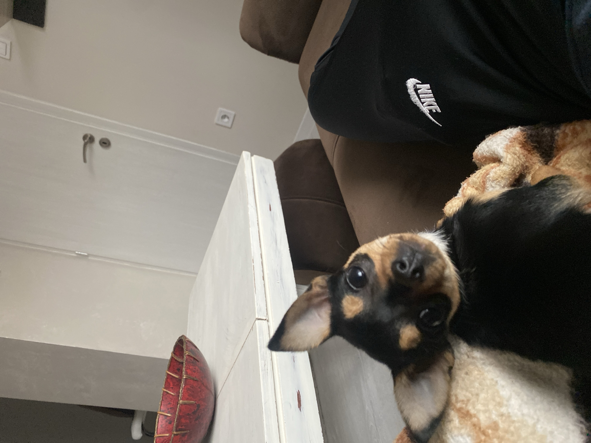 A close-up, rotated view depicts a black and brown dog resting on a tan and brown patterned blanket. The dog's head is in the foreground, facing upwards with its eyes visible. A person wearing black Nike sweatpants is partially visible behind the dog. A white cabinet with a red bowl on it sits to the left of the dog. The location is likely indoors, judging by the wall and electrical outlet. There is no visible information that suggests the location is Asenovgrad, Bulgaria.