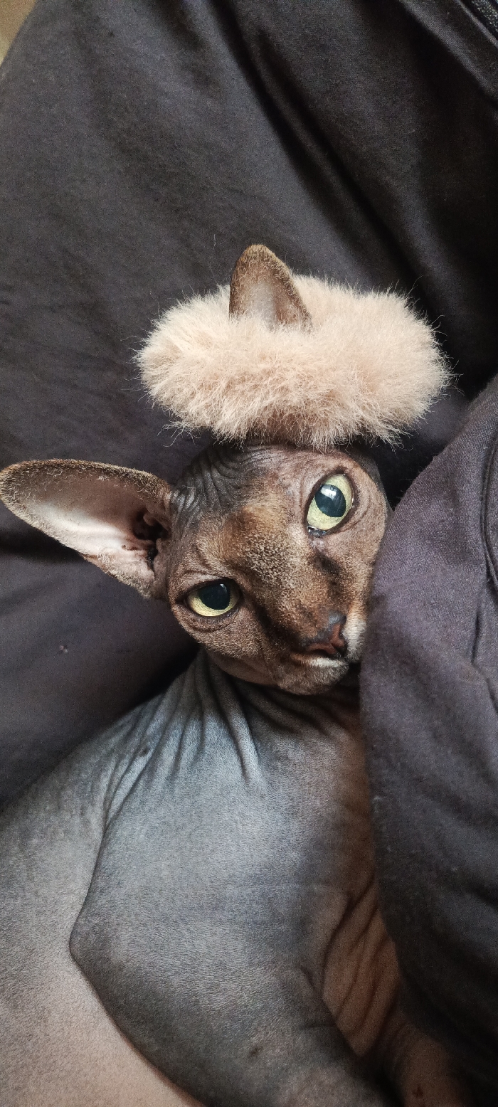 A close-up, top-down view displays a Sphynx cat located in Novoshakhtinsk, Russia. The cat exhibits mottled brown and grey hairless, wrinkled skin, large pointed ears, and prominent green-yellow eyes with dark, dilated pupils. A light brown, circular, fluffy accessory rests on top of its head, between its ears. The cat's head is tilted slightly, and its gaze is directed towards the viewer. The animal is positioned amidst dark grey, plain-textured fabric, suggesting an indoor environment on a soft surface. No other subjects or objects are discernible.