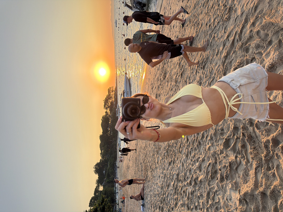 - "A young adult female, positioned in the foreground, captures a selfie on a sandy beach at sunset in Pattaya City, Thailand" by FM-PcEqo1, licensed under CC BY 4.0