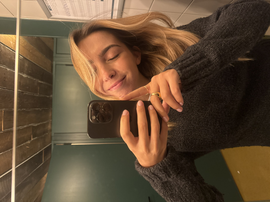 A young female is captured in a mirror selfie within what appears to be a restroom or changing area in Eindhoven, Netherlands. She holds a dark-colored smartphone, likely an iPhone Pro model, in her right hand. Her eyes are closed, and she displays a subtle smile, with her head slightly tilted to her left. She has shoulder-length blonde hair and wears a dark gray knitted sweater. Her left hand, partially visible, touches her jawline; it features a thin gold band on the ring finger and a thicker, rounded gold ring on the pinky finger. Her fingernails are painted a light pink. The background, reflected in the mirror, shows a ceiling composed of wooden planks, a dark teal-colored wall with a closed door, a light yellow floor, and a white tiled wall with a white-framed document containing black text.