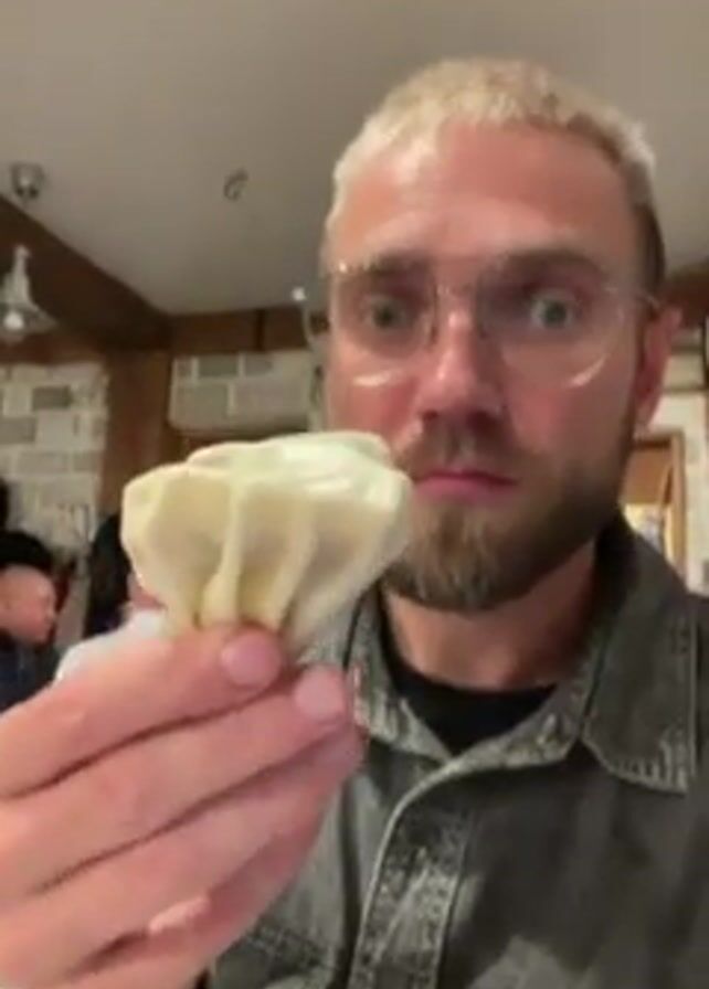 A blond man with a beard and glasses holds up a dumpling and eats it