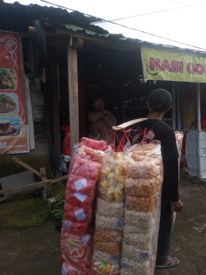 A man in a black shirt and cap stands on a wet road, carrying large bags of snacks on a shoulder yoke. Behind him, a woman in a headscarf stands in the doorway of a small shop, which has a sign reading "Nasi Goreng" above it. Another sign, with pictures of food, is to the left of the shop. The area appears modest and possibly rural.