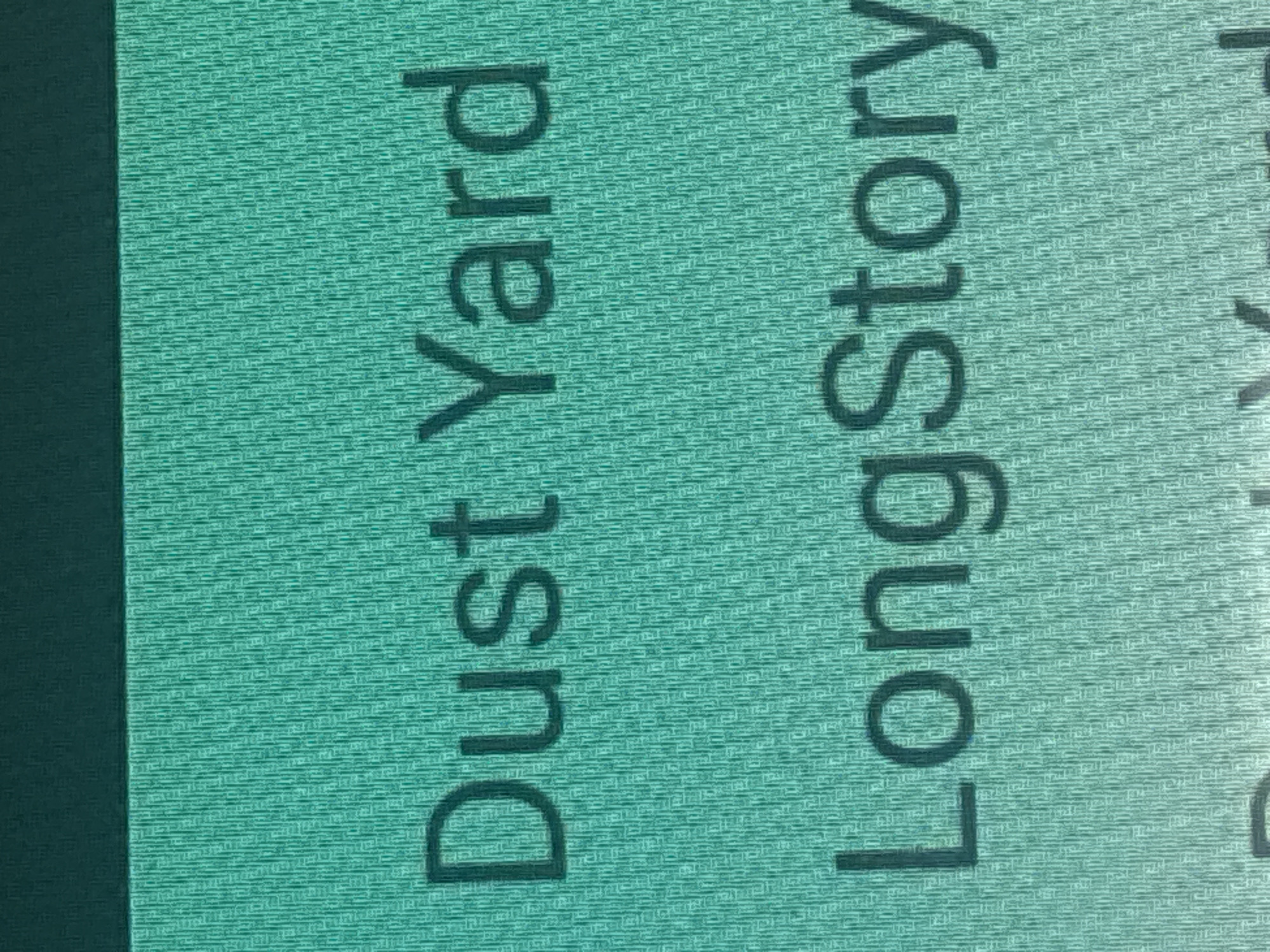 text printed on a green surface. The text reads "Dust Yard" and "Longstory". The image is likely a close-up of a sign or a book cover. There is a dark bar on the left side of the image.