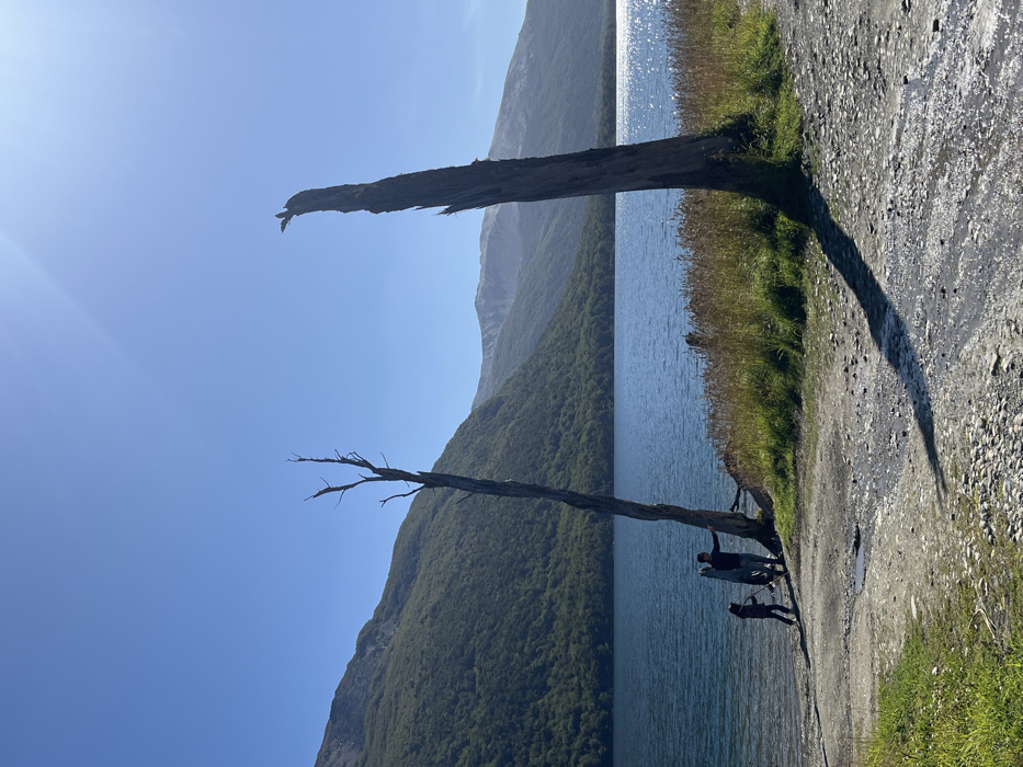 The image depicts a natural landscape located in Unknown, Argentina, under a clear, bright blue sky with direct sunlight. A large, calm lake occupies the middle ground, reflecting sunlight on its surface. The left side of the lake is bordered by steep, densely forested mountains, while lighter-toned, less vegetated mountains are visible in the distant background on the right. In the foreground, a gravelly and dirt path with scattered patches of green and dry grass leads to the water's edge. Two prominent, tall, slender dead tree trunks (snags) stand upright in the foreground. The leftmost snag is taller and has multiple bare branches at its apex. The rightmost snag is thicker, appears broken at the top, and casts a long, sharp shadow diagonally across the gravel path towards the lower right. Near the base of the left dead tree, two individuals are present. An adult male, dressed in dark clothing, stands holding a white, rectangular object resembling a paddleboard or surfboard vertically. He is gesturing with his right arm towards the lake. To his immediate left, a child, also in dark attire, stands close to the water's edge, holding a stick or pole, possibly a paddle, and appears to be looking towards the lake. Tall, dry grasses and reeds line the immediate shoreline between the path and the lake.