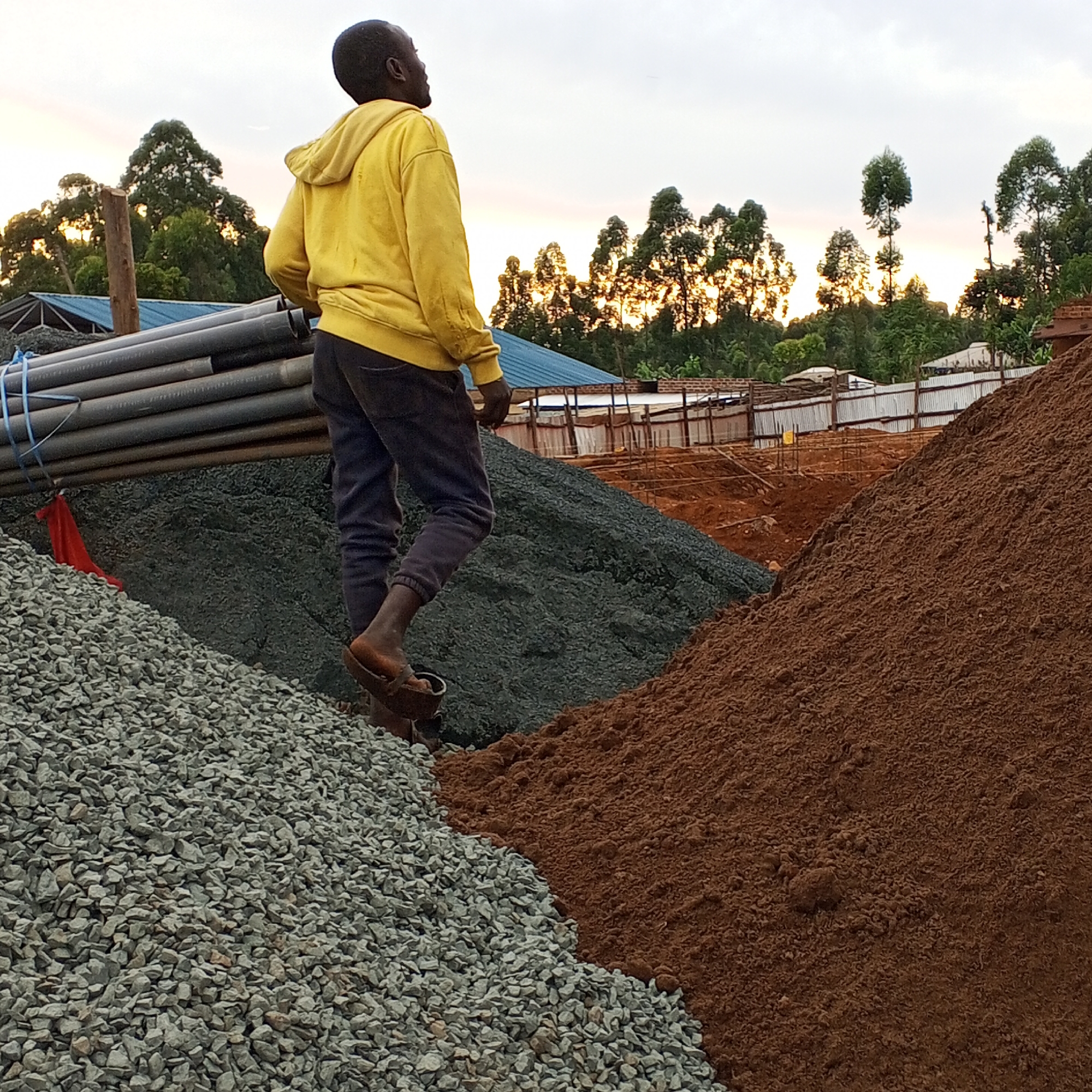A man in a yellow hooded sweatshirt and dark pants stands atop a pile of gray gravel, with brown soil and gray sand piles adjacent. He is facing away from the camera, looking towards the horizon where the sun is setting behind trees. Behind the gravel and sand piles, there are gray PVC pipes and a partially constructed building with a blue roof. The location is Borabu Chitago ward, Kenya.