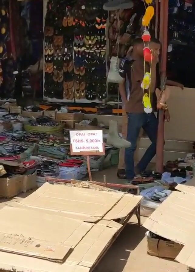 n outdoor marketplace stall. A wide selection of shoes and sandals are displayed on cardboard mats on the ground and arranged on shelves in the background. Clothing is displayed on mannequins in the background, including long, patterned dresses. Several pairs of shoes hang from the stall’s roof. A sign on the ground reads “OFA! OFA! TSHS 5,000/= KARIBUNI SANA." Several people can be seen looking at the merchandise. A man stands by a pole holding some items. The ground is dusty and uneven. The scene appears to be a busy, open-air market. The camera slowly pans across the scene.